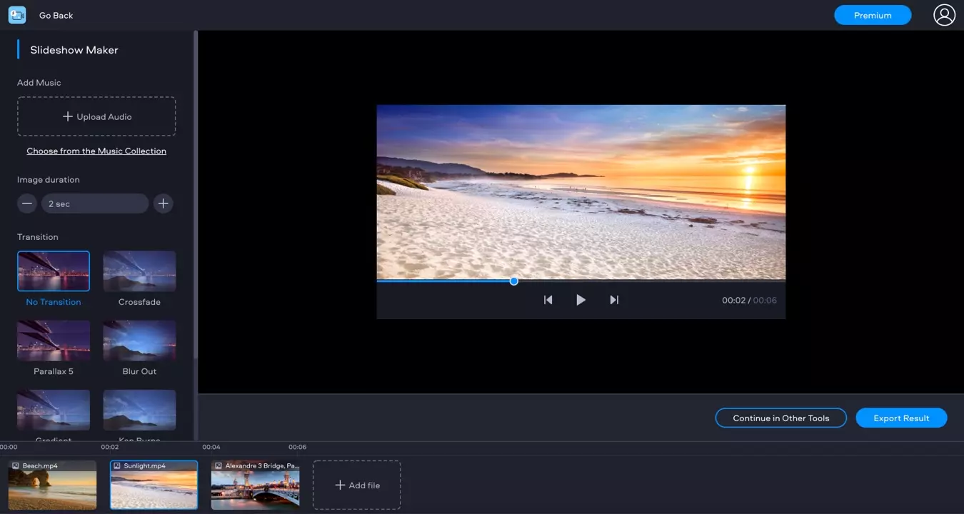 Wählen Sie den Übergangstyp und die Dauer der Bildanzeige. Fügen Sie Ihre eigene Musik hinzu oder wählen Sie etwas aus der integrierten Sammlung. Klicken Sie auf Continue, um Ihre Bilder zu kombinieren.